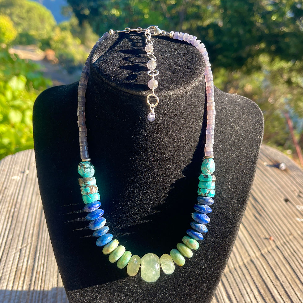 Green and Blue Gemstone Necklace, Turquoise, Lapis, Iolite, Rutilated Quartz